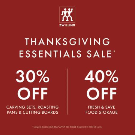 *Thanksgiving Essentials Sale valid November 3-26, 2025. Offer may not be combined with any other coupons, discounts or offers. Offer not valid on prior purchases, special orders, gift cards or taxes. Promotion only available in our ZWILLING Retail and Factory Stores located in the United States. Some exclusions may apply. See store associate for details.