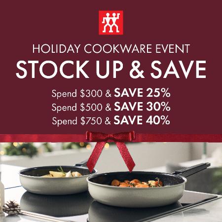 *Holiday Cookware Event valid December 1-7, 2025. Offer applies to cookware items only. Holiday Cookware Event savings will apply once your cookware purchase meets the qualifying threshold: $300 for 25% off, $500 for 30% off, or $750 for 40% off. Qualifying thresholds are calculated before tax. Offer(s) may not be combined with any other coupons, discounts, or offers. Offer(s) not valid on prior purchases, special orders, gift cards or taxes. Promotion only available in our ZWILLING Retail and Factory Stores located in the United States. Some exclusions may apply. See store associate for details.