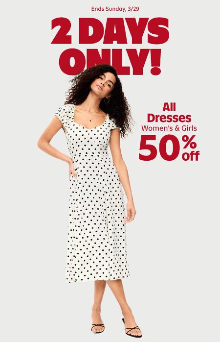 Get it now! Shop in store and get 50% off all dresses for women, girls, toddler and babies.
