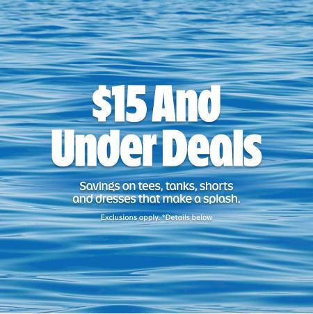 Shop in-store and enjoy $15 & under deals on tees, tanks, shorts, & dresses.